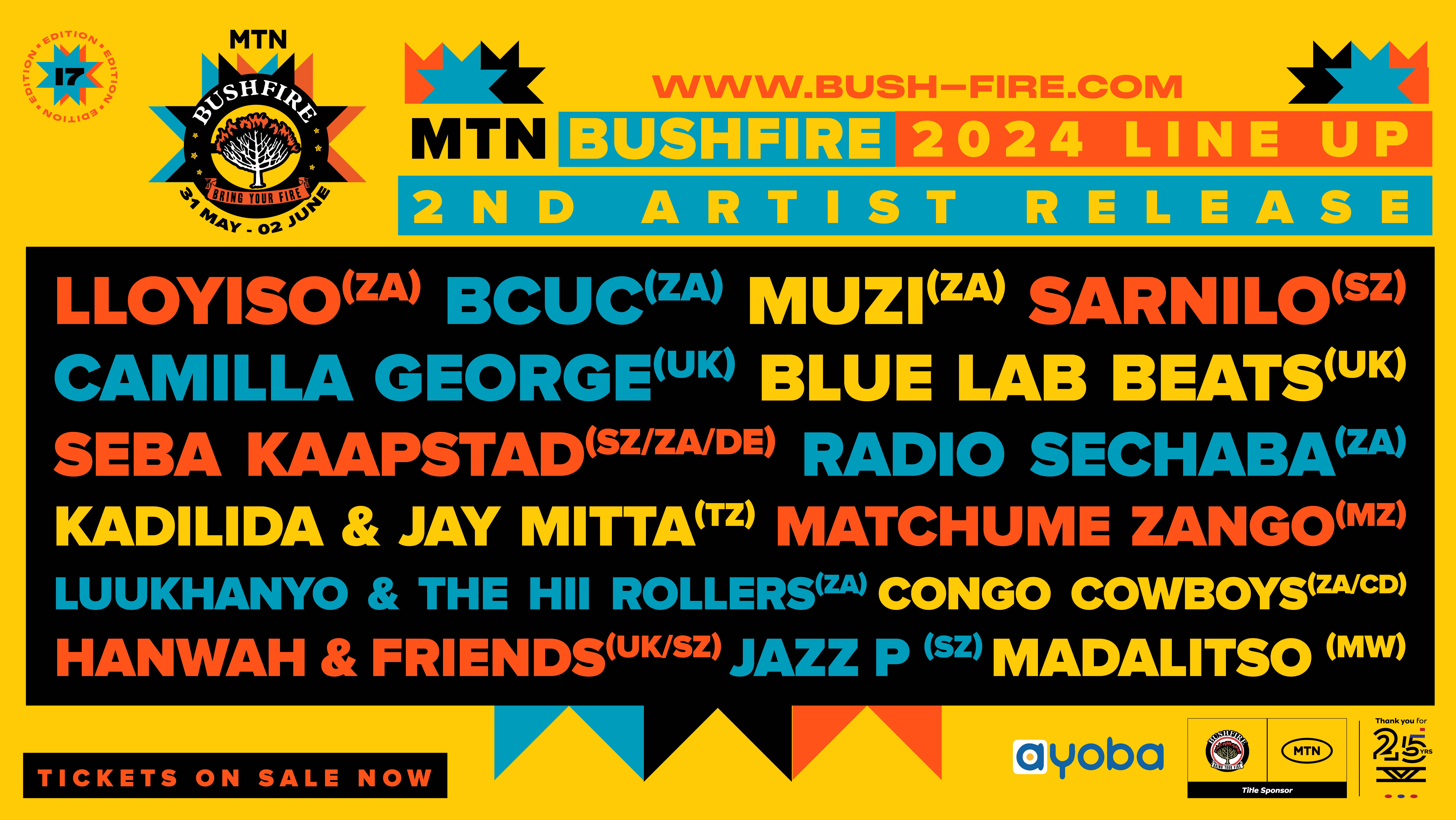 Tickets can be purchased from the MTN Bushfire website, where glamping, camping and travel options can also be found, or with MTN Mobile Money via MoMo Marketplace on WhatsApp (Eswatini only). To learn more please visit the MTN Bushfire website, https://www.bush-fire.com/ and look out for further acts to be announced @mtnbushfire on the all-in-one chat and music app Ayoba, as well as Facebook, Twitter and Instagram.